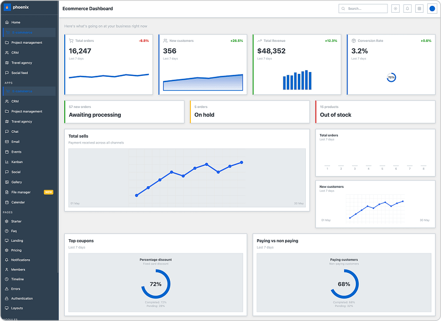 Two dashboards, eCommerce modules, four general pages, six authentication pages, one starter, and two error pages are all provided in the box along with Phoenix.